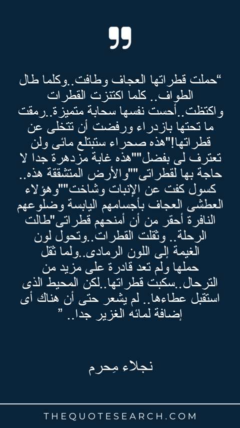 “حملت قطراتها العجاف وطافت..وكلما طال الطواف.. كلما اكتنزت القطرات واكتظت..أحست نفسها سحابة متميزة..رمقت ما تحتها بازدراء ورفضت أن تتخلى عن قطراتها!"هذه صحراء ستبتلع مائى ولن تعترف لى بفضل""هذه غابة مزدهرة جدا لا حاجة بها لقطراتى""والأرض المتشققة هذه.. كسول كفت عن الإنبات وشاخت""وهؤلاء العطشى العجاف بأجسامهم اليابسة وضلوعهم النافرة أحقر من أن أمنحهم قطراتى"طالت الرحلة.. وثقلت القطرات..وتحول لون الغيمة إلى اللون الرمادى..ولما ثقل حملها ولم تعد قادرة على مزيد من الترحال..سكبت قطراتها..لكن المحيط الذى استقبل عطاءها.. لم يشعر حتى أن هناك أى إضافة لمائه الغزير جدا.. ”