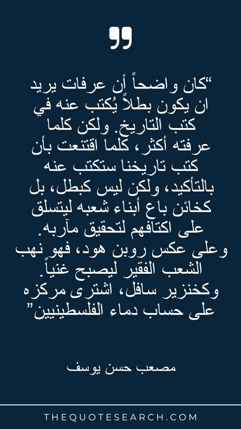 “كان واضحاً أن عرفات يريد ان يكون بطلاً يُكتب عنه في كتب التاريخ. ولكن كلما عرفته أكثر، كلما اقتنعت بأن كتب تاريخنا ستكتب عنه بالتأكيد، ولكن ليس كبطل، بل كخائن باع أبناء شعبه ليتسلق على اكتافهم لتحقيق مآربه. وعلى عكس روبن هود، فهو نهب الشعب الفقير ليصبح غنياً. وكخنزير سافل، اشترى مركزه على حساب دماء الفلسطينيين”