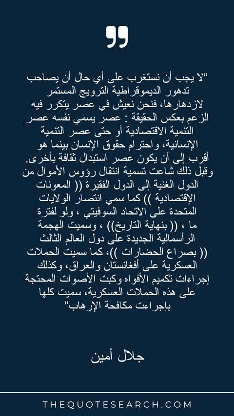 “فى ظل الهيمنة الامريكية. الولايات المتحدة وإسرائيل على إستعداد لأن تفعلا المستحيل من أجل تخريب التنمية ، وتعطيل التطور الديمقراطى ووضع العراقيل فى وجه إصلاح التعليم والثقافة وفى طريق تحقيق اى صورة مجدية للتعاون العربى او الوحدة العربية . يؤيد هذا الاستنتاج ان العرب (مثل غيرهم من الامم )كانوا يثبتوا قدرتهم على التقدم فى مختلف الميادين بمجرد ان تتاح لهم ظروف دوليةمواتية. حدث هذا مرة فى عهد محمد على ومرة فى عهد عبد الناصر. ولكن الفترتين كانتا للأسف قصيرتين للغاية، فلم تدم فى عصر محمد على أكثر من ثلاثين عاما ، بأقصى تقدير (1810 -1840 ) ولم تدم فى عصر عبد الناصر ، بأقصى تقدير أيضا على 11 عاما( 56- 1967 )كان التقدم فى مختلف الميادين الاقتصاد والتعليم والثقافة والاصلاح الاجتماعى مدهشا بكافة المقاييس فما الذى حدث بعد ان بدأت الولايات المتحدة تمارس قبضتها القوية ؟”