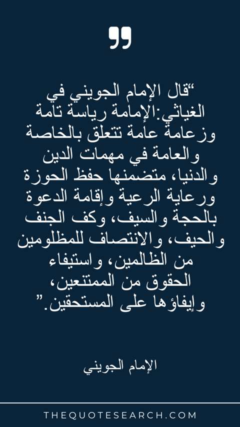 “قال الإمام الجويني في الغياثي:الإمامة رياسة تامة وزعامة عامة تتعلق بالخاصة والعامة في مهمات الدين والدنيا، متضمنها حفظ الحوزة ورعاية الرعية وإقامة الدعوة بالحجة والسيف، وكف الجنف والحيف، والانتصاف للمظلومين من الظالمين، واستيفاء الحقوق من الممتنعين، وإيفاؤها على المستحقين.”
