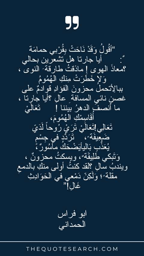 “أقُولُ وَقَدْ نَاحَتْ بِقُرْبي حمامَة ٌ: أيا جارتا هل تشعرين بحالي ؟معاذَ الهوى ! ماذقتُ طارقة َ النوى ، وَلا خَطَرَتْ مِنكِ الهُمُومُ ببالِأتحملُ محزونَ الفؤادِ قوادمٌ على غصنٍ نائي المسافة ِ عالِ ؟أيا جارتا ، ما أنصفَ الدهرُ بيننا ! تَعَالَيْ أُقَاسِمْكِ الهُمُومَ، تَعَالِي!تَعَالَيْ تَرَيْ رُوحاً لَدَيّ ضَعِيفَة ً، تَرَدّدُ في جِسْمٍ يُعَذّبُ بَاليأيَضْحَكُ مأسُورٌ، وَتَبكي طَلِيقَة ٌ، ويسكتُ محزونٌ ، ويندبُ سالِ ؟لقد كنتُ أولى منكِ بالدمعِ مقلة ً؛ وَلَكِنّ دَمْعي في الحَوَادِثِ غَالِ!”