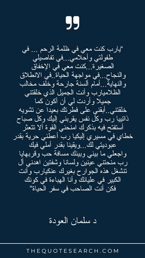 “يارب كنت معي في ظلمة الرحم ... في طفولتي وأحلامي...في تفاصيلي الصغيرة...كنت معي في الإخفاق والنجاح...في مواجهة الحياة..في الانطلاق والنهاية...أمام ألسنة جارحة وخلف مخالب الظلاميارب وأنت الجميل الذي خلقتني جميلا وأردت لي أن أكون كما خلقتني..أبقني على فطرتك بعيدا عن تشويه ذاتييا رب وكل نفس يقربني إليك وكل صباح أستفتح فيه بذكرك امنحني القوة ألا تتعثر خطاي في مسيري إليكيا رب أعطني حرية بقدر عبوديتي لك...ويقينا بقدر أملي فيك واجعلي ما بيني وبينك مسافة حب وقربهايا رب منحتني عينين ولسانا وشفتين اهدني أل تنشغل هذه الجوارح بغيرك عنكيارب وأنت الكبير في عليائك وأنا الهباءة في كونك فكن أنت الصاحب في سفر الحياة”