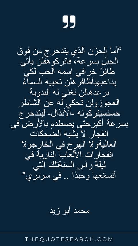 “أما الحزن الذي يتدحرج من فوق الجبل بسرعة، فاتركوهفلن يأتي طائرٌ خرافي اسمه الحب لكي يداعبهبأظافرهلن تحييه السماءُ برعدهالن تغني له البدوية العجوزولن تحكي له عن الشاطر حسنسيتركونه -الأنذال- ليتدحرج بسرعة أكبرحتى يصطدم بالأرض في انفجار لا يشبه الضحكات العاليةولا الهرج في الخارجولا انفجارات الألعاب النارية في ليلة رأس السنةتلك التي أتسمّعها وحيدًا .. في سريري”