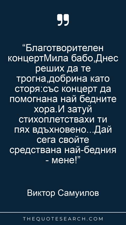 “Благотворителен концертМила бабо,Днес реших да те трогна,добрина като сторя:със концерт да помогнана най бедните хора.И затуй стихоплетствахи ти пях вдъхновено...Дай сега свойте средствана най-бедния - мене!”