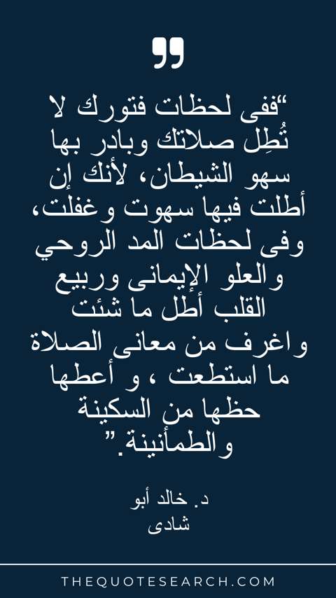 “ففى لحظات فتورك لا تُطِل صلاتك وبادر بها سهو الشيطان، لأنك إن أطلت فيها سهوت وغفلت، وفى لحظات المد الروحي والعلو الإيمانى وربيع القلب أطل ما شئت واغرف من معانى الصلاة ما استطعت ، و أعطها حظها من السكينة والطمأنينة.”