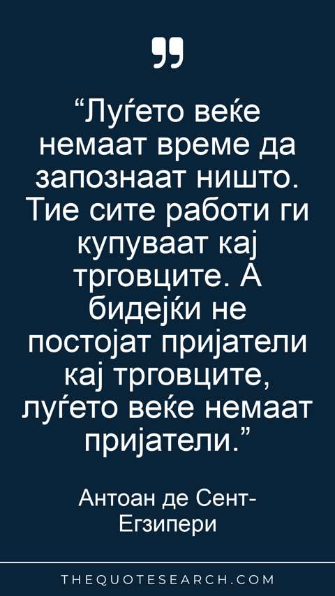 “Луѓето веќе немаат време да запознаат ништо. Тие сите работи ги купуваат кај трговците. А бидејќи не постојат пријатели кај трговците, луѓето веќе немаат пријатели.”
