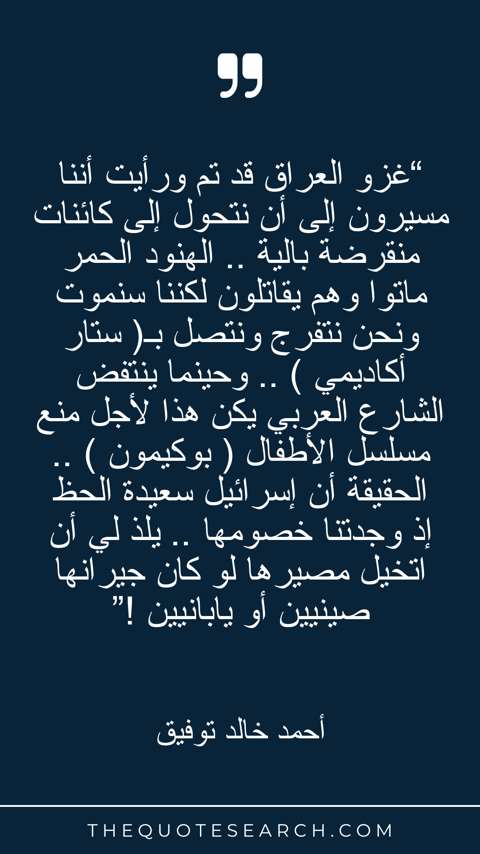 “غزو العراق قد تم ورأيت أننا مسيرون إلى أن نتحول إلى كائنات منقرضة بالية .. الهنود الحمر ماتوا وهم يقاتلون لكننا سنموت ونحن نتفرج ونتصل بـ( ستار أكاديمي ) .. وحينما ينتفض الشارع العربي يكن هذا لأجل منع مسلسل الأطفال ( بوكيمون ) .. الحقيقة أن إسرائيل سعيدة الحظ إذ وجدتنا خصومها .. يلذ لي أن اتخيل مصيرها لو كان جيرانها صينيين أو يابانيين !”
