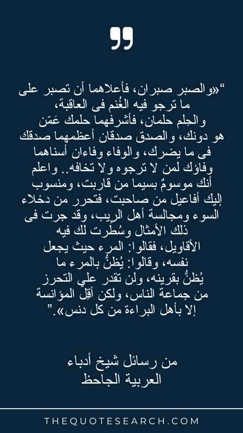 “«والصبر صبران، فأعلاهما أن تصبر على ما ترجو فيه الغُنم فى العاقبة، والحِلم حلمان، فأشرفهما حلمك عَمّن هو دونك، والصدق صدقان أعظمهما صدقك فى ما يضرك، والوفاء وفاءان أسناهما وفاؤك لمن لا ترجوه ولا تخافه.. واعلم أنك موسومٌ بسيما من قاربت، ومنسوب إليك أفاعيل من صاحبت، فتحرر من دخلاء السوء ومجالسة أهل الريب، وقد جرت فى ذلك الأمثال وسُطِّرت لك فيه الأقاويل، فقالوا: المرء حيث يجعل نفسه، وقالوا: يُظنُّ بالمرء ما يُظنُّ بقرينه، ولن تقدر على التحرز من جماعة الناس، ولكن أقِلّ المؤانسة إلا بأهل البراءة من كل دنس».”