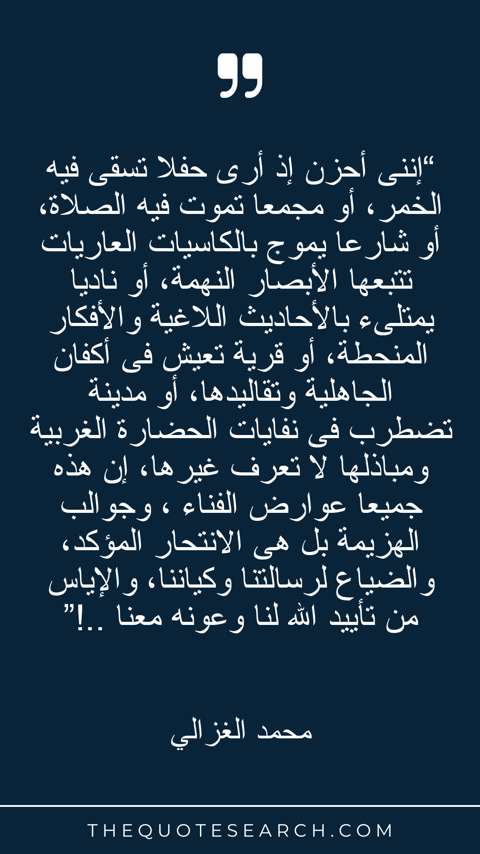 “إننى أحزن إذ أرى حفلا تسقى فيه الخمر، أو مجمعا تموت فيه الصلاة، أو شارعا يموج بالكاسيات العاريات تتبعها الأبصار النهمة، أو ناديا يمتلىء بالأحاديث اللاغية والأفكار المنحطة، أو قرية تعيش فى أكفان الجاهلية وتقاليدها، أو مدينة تضطرب فى نفايات الحضارة الغربية ومباذلها لا تعرف غيرها، إن هذه جميعا عوارض الفناء ، وجوالب الهزيمة بل هى الانتحار المؤكد، والضياع لرسالتنا وكياننا، والإياس من تأييد الله لنا وعونه معنا ..!”