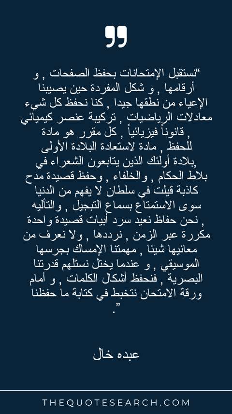 “نستقبل الإمتحانات بحفظ الصفحات , و أرقامها , و شكل المفردة حين يصيبنا الإعياء من نطقها جيدا , كنا نحفظ كل شيء معادلات الرياضيات , تركيبة عنصر كيميائي , قانوناً فيزيائياً , كل مقرر هو مادة للحفظ , مادة لاستعادة البلادة الأولى ,بلادة أولئك الذين يتابعون الشعراء في بلاط الحكام , والخلفاء , وحفظ قصيدة مدح كاذبة قيلت في سلطان لا يفهم من الدنيا سوى الاستمتاع بسماع التبجيل , والتأليه , نحن حفاظ نعيد سرد أبيات قصيدة واحدة مكررة عبر الزمن , نرددها , ولا نعرف من معانيها شيئا , مهمتنا الإمساك بجرسها الموسيقي , و عندما يختل نستلهم قدرتنا البصرية , فنحفظ أشكال الكلمات , و أمام ورقة الامتحان نتخبط في كتابة ما حفظنا .”