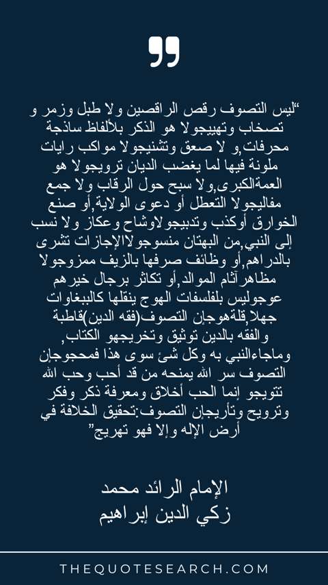 “ليس التصوف رقص الراقصين ولا طبل وزمر و تصخاب وتهييجولا هو الذكر بلألفاظ ساذجة محرفات,و لا صعق وتشنيجولا مواكب رايات ملونة فيها لما يغضب الديان ترويجولا هو العمةالكبرى,ولا سبح حول الرقاب ولا جمع مفاليجولا التعطل أو دعوى الولاية,أو صنع الخوارق أوكذب وتدبيجولاوشاح وعكاز ولا نسب إلى النبي,من البهتان منسوجولاالإجازات تشرى بالدراهم,أو وظائف صرفها بالزيف ممزوجولا مظاهرآثام الموالد,أو تكاثر برجال خيرهم عوجوليس بلفلسفات الهوج ينقلها كالببغاوات جهلا,قلةهوجإن التصوف(فقه الدين)قاطبة والفقه بالدين توثيق وتخريجهو الكتاب, وماجاءالنبي به وكل شئ سوى هذا فمحجوجإن التصوف سر الله يمنحه من قد أحب وحب الله تتويجو إنما الحب أخلاق ومعرفة ذكر وفكر وترويح وتأريجإن التصوف:تحقيق الخلافة في أرض الإله وإلا فهو تهريج”