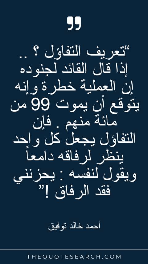 “تعريف التفاؤل ؟ .. إذا قال القائد لجنوده إن العملية خطرة وإنه يتوقع أن يموت 99 من مائة منهم . فإن التفاؤل يجعل كل واحد ينظر لرفاقه دامعاً ويقول لنفسه : يحزنني فقد الرفاق !”