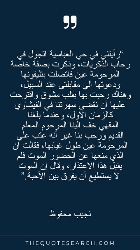 “رأيتني في حي العباسية اتجول في رحاب الذكريات، وذكرت بصفة خاصة المرحومة عين فاتصلت بتليفونها ودعوتها الي مقابلتي عند السبيل، وهناك رحبت بها بقلب مشوق واقترحت عليها أن نقضي سهرتنا في الفيشاوي كالزمان الاول، وعندما بلغنا المقهي خف الينا المرحوم المعلم القديم ورحب بنا غير أنه عتب علي المرحومة عين طول غيابها، فقالت ان الذي منعها عن الحضور الموت فلم يقبل هذا الاعتذار، وقال إن الموت لا يستطيع أن يفرق بين الأحبة.”