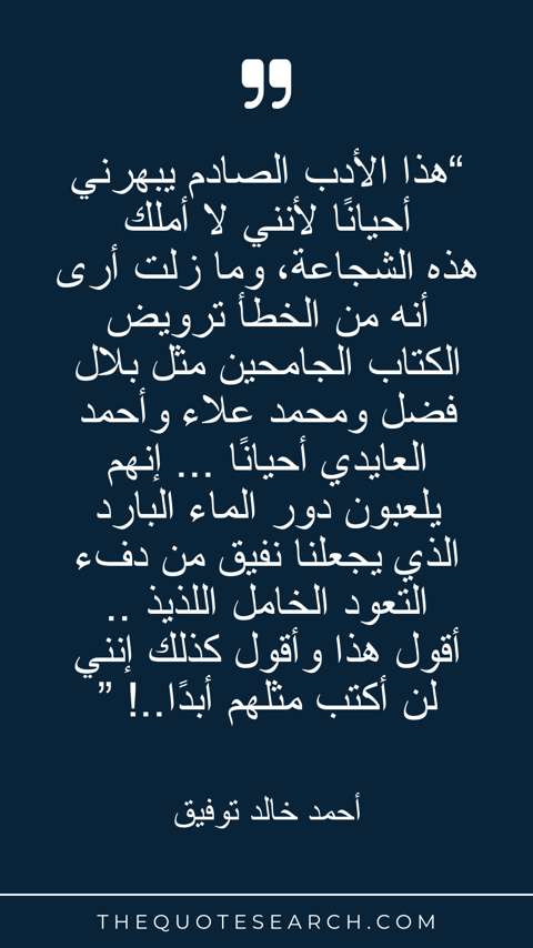 “هذا الأدب الصادم يبهرني أحيانًا لأنني لا أملك هذه الشجاعة، وما زلت أرى أنه من الخطأ ترويض الكتاب الجامحين مثل بلال فضل ومحمد علاء وأحمد العايدي أحيانًا ... إنهم يلعبون دور الماء البارد الذي يجعلنا نفيق من دفء التعود الخامل اللذيذ .. أقول هذا وأقول كذلك إنني لن أكتب مثلهم أبدًا..! ”