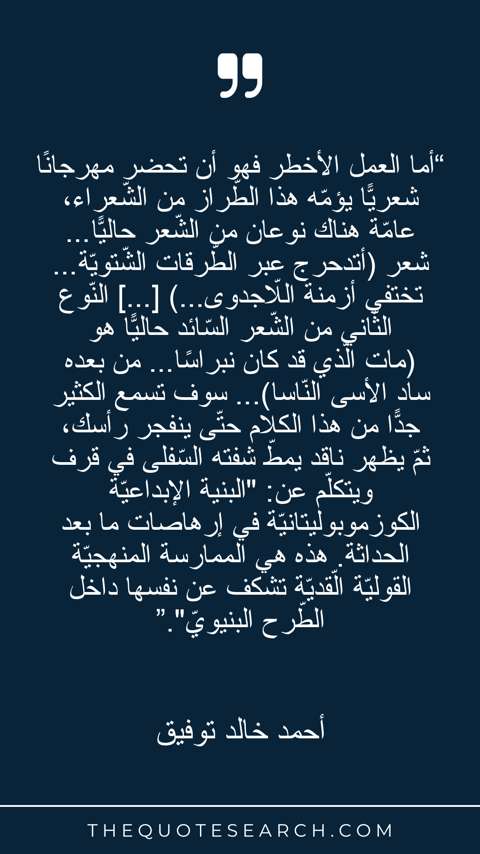 “أما العمل الأخطر فهو أن تحضر مهرجانًا شعريًّا يؤمّه هذا الطّراز من الشّعراء، عامّة هناك نوعان من الشّعر حاليًّا... شعر (أتدحرج عبر الطّرقات الشّتويّة... تختفي أزمنة اللّاجدوى...) [...] النّوع الثّاني من الشّعر السّائد حاليًّا هو (مات الّذي قد كان نبراسًا... من بعده ساد الأسى النّاسا)... سوف تسمع الكثير جدًّا من هذا الكلام حتّى ينفجر رأسك، ثمّ يظهر ناقد يمطّ شفته السّفلى في قرف ويتكلّم عن: "البنية الإبداعيّة الكوزموبوليتانيّة في إرهاصات ما بعد الحداثة. هذه هي الممارسة المنهجيّة القوليّة الّقديّة تشكف عن نفسها داخل الطّرح البنيويّ".”