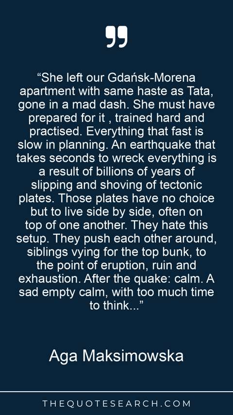 “She left our Gdańsk-Morena apartment with same haste as Tata, gone in a mad dash. She must have prepared for it , trained hard and practised. Everything that fast is slow in planning. An earthquake that takes seconds to wreck everything is a result of billions of years of slipping and shoving of tectonic plates. Those plates have no choice but to live side by side, often on top of one another. They hate this setup. They push each other around, siblings vying for the top bunk, to the point of eruption, ruin and exhaustion. After the quake: calm. A sad empty calm, with too much time to think...”