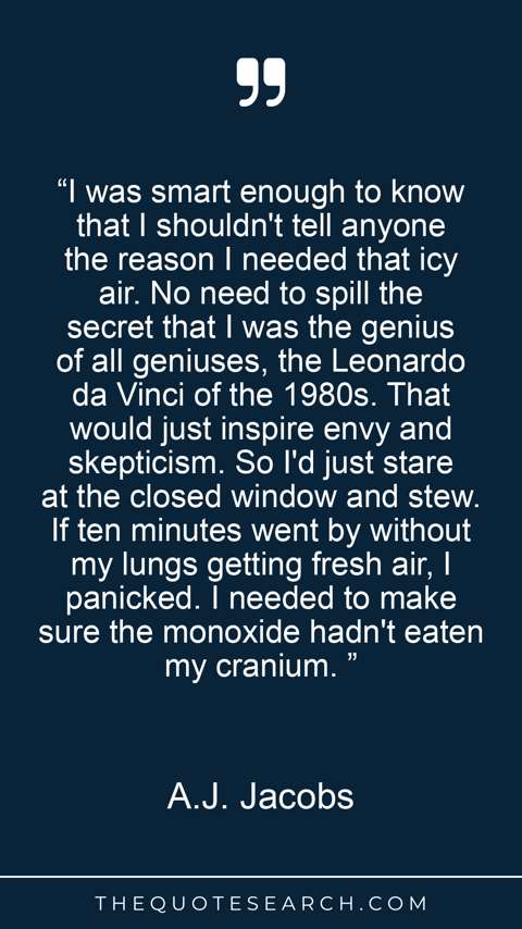 “I was smart enough to know that I shouldn't tell anyone the reason I needed that icy air. No need to spill the secret that I was the genius of all geniuses, the Leonardo da Vinci of the 1980s. That would just inspire envy and skepticism. So I'd just stare at the closed window and stew. If ten minutes went by without my lungs getting fresh air, I panicked. I needed to make sure the monoxide hadn't eaten my cranium. ”