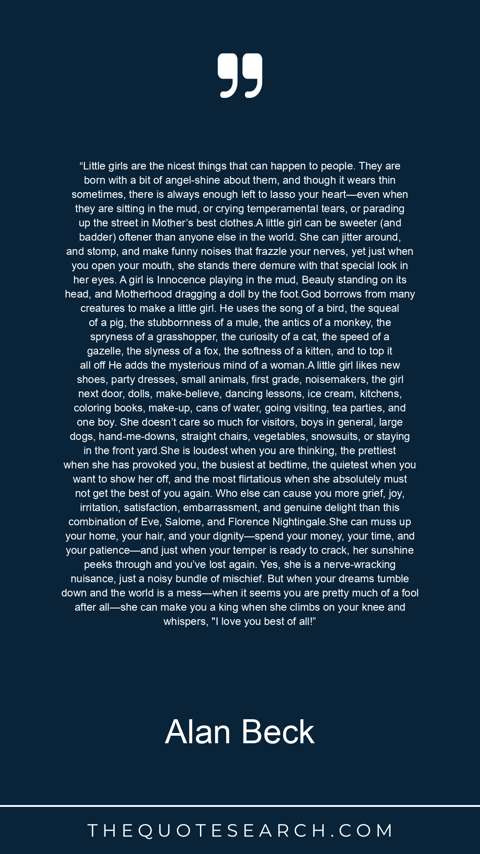 “Little girls are the nicest things that can happen to people. They are born with a bit of angel-shine about them, and though it wears thin sometimes, there is always enough left to lasso your heart—even when they are sitting in the mud, or crying temperamental tears, or parading up the street in Mother’s best clothes.A little girl can be sweeter (and badder) oftener than anyone else in the world. She can jitter around, and stomp, and make funny noises that frazzle your nerves, yet just when you open your mouth, she stands there demure with that special look in her eyes. A girl is Innocence playing in the mud, Beauty standing on its head, and Motherhood dragging a doll by the foot.God borrows from many creatures to make a little girl. He uses the song of a bird, the squeal of a pig, the stubbornness of a mule, the antics of a monkey, the spryness of a grasshopper, the curiosity of a cat, the speed of a gazelle, the slyness of a fox, the softness of a kitten, and to top it all off He adds the mysterious mind of a woman.A little girl likes new shoes, party dresses, small animals, first grade, noisemakers, the girl next door, dolls, make-believe, dancing lessons, ice cream, kitchens, coloring books, make-up, cans of water, going visiting, tea parties, and one boy. She doesn’t care so much for visitors, boys in general, large dogs, hand-me-downs, straight chairs, vegetables, snowsuits, or staying in the front yard.She is loudest when you are thinking, the prettiest when she has provoked you, the busiest at bedtime, the quietest when you want to show her off, and the most flirtatious when she absolutely must not get the best of you again. Who else can cause you more grief, joy, irritation, satisfaction, embarrassment, and genuine delight than this combination of Eve, Salome, and Florence Nightingale.She can muss up your home, your hair, and your dignity—spend your money, your time, and your patience—and just when your temper is ready to crack, her sunshine peeks through and you’ve lost again. Yes, she is a nerve-wracking nuisance, just a noisy bundle of mischief. But when your dreams tumble down and the world is a mess—when it seems you are pretty much of a fool after all—she can make you a king when she climbs on your knee and whispers, "I love you best of all!”