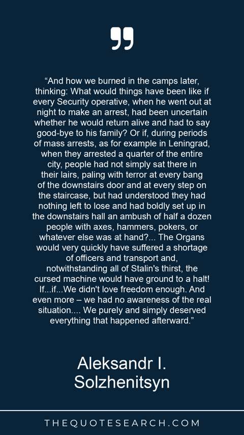 “And how we burned in the camps later, thinking: What would things have been like if every Security operative, when he went out at night to make an arrest, had been uncertain whether he would return alive and had to say good-bye to his family? Or if, during periods of mass arrests, as for example in Leningrad, when they arrested a quarter of the entire city, people had not simply sat there in their lairs, paling with terror at every bang of the downstairs door and at every step on the staircase, but had understood they had nothing left to lose and had boldly set up in the downstairs hall an ambush of half a dozen people with axes, hammers, pokers, or whatever else was at hand?... The Organs would very quickly have suffered a shortage of officers and transport and, notwithstanding all of Stalin's thirst, the cursed machine would have ground to a halt! If...if...We didn't love freedom enough. And even more – we had no awareness of the real situation.... We purely and simply deserved everything that happened afterward.”