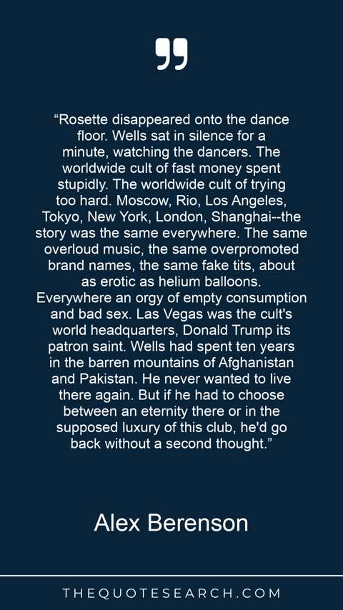 “Rosette disappeared onto the dance floor. Wells sat in silence for a minute, watching the dancers. The worldwide cult of fast money spent stupidly. The worldwide cult of trying too hard. Moscow, Rio, Los Angeles, Tokyo, New York, London, Shanghai--the story was the same everywhere. The same overloud music, the same overpromoted brand names, the same fake tits, about as erotic as helium balloons. Everywhere an orgy of empty consumption and bad sex. Las Vegas was the cult's world headquarters, Donald Trump its patron saint. Wells had spent ten years in the barren mountains of Afghanistan and Pakistan. He never wanted to live there again. But if he had to choose between an eternity there or in the supposed luxury of this club, he'd go back without a second thought.”