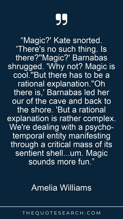 “Magic?' Kate snorted. 'There's no such thing. Is there?''Magic?' Barnabas shrugged. 'Why not? Magic is cool.''But there has to be a rational explanation.''Oh there is,' Barnabas led her our of the cave and back to the shore. 'But a rational explanation is rather complex. We're dealing with a psycho-temporal entity manifesting through a critical mass of its sentient shell...um. Magic sounds more fun.”