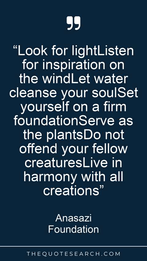 “Look for lightListen for inspiration on the windLet water cleanse your soulSet yourself on a firm foundationServe as the plantsDo not offend your fellow creaturesLive in harmony with all creations”
