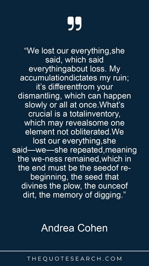 “We lost our everything,she said, which said everythingabout loss. My accumulationdictates my ruin; it’s differentfrom your dismantling, which can happen slowly or all at once.What’s crucial is a totalinventory, which may revealsome one element not obliterated.We lost our everything,she said—we—she repeated,meaning the we-ness remained,which in the end must be the seedof re-beginning, the seed that divines the plow, the ounceof dirt, the memory of digging.”