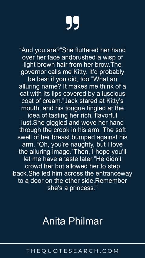 “And you are?”She fluttered her hand over her face andbrushed a wisp of light brown hair from her brow.The governor calls me Kitty. It’d probably be best if you did, too.”What an alluring name? It makes me think of a cat with its lips covered by a luscious coat of cream.”Jack stared at Kitty’s mouth, and his tongue tingled at the idea of tasting her rich, flavorful lust.She giggled and wove her hand through the crook in his arm. The soft swell of her breast bumped against his arm. “Oh, you’re naughty, but I love the alluring image.”Then, I hope you’ll let me have a taste later.”He didn’t crowd her but allowed her to step back.She led him across the entranceway to a door on the other side.Remember she’s a princess.”