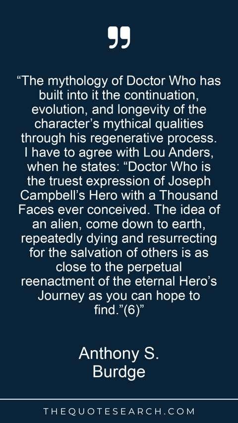 “The mythology of Doctor Who has built into it the continuation, evolution, and longevity of the character’s mythical qualities through his regenerative process. I have to agree with Lou Anders, when he states: “Doctor Who is the truest expression of Joseph Campbell’s Hero with a Thousand Faces ever conceived. The idea of an alien, come down to earth, repeatedly dying and resurrecting for the salvation of others is as close to the perpetual reenactment of the eternal Hero’s Journey as you can hope to find.”(6)”