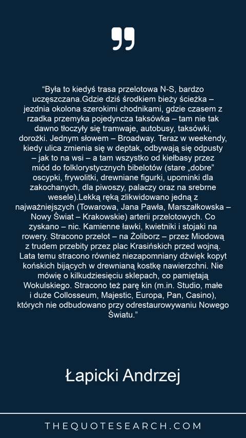 “Była to kiedyś trasa przelotowa N-S, bardzo uczęszczana.Gdzie dziś środkiem bieży ścieżka – jezdnia okolona szerokimi chodnikami, gdzie czasem z rzadka przemyka pojedyncza taksówka – tam nie tak dawno tłoczyły się tramwaje, autobusy, taksówki, dorożki. Jednym słowem – Broadway. Teraz w weekendy, kiedy ulica zmienia się w deptak, odbywają się odpusty – jak to na wsi – a tam wszystko od kiełbasy przez miód do folklorystycznych bibelotów (stare „dobre” oscypki, frywolitki, drewniane figurki, upominki dla zakochanych, dla piwoszy, palaczy oraz na srebrne wesele).Lekką ręką zlikwidowano jedną z najważniejszych (Towarowa, Jana Pawła, Marszałkowska – Nowy Świat – Krakowskie) arterii przelotowych. Co zyskano – nic. Kamienne ławki, kwietniki i stojaki na rowery. Stracono przelot – na Żoliborz – przez Miodową z trudem przebity przez plac Krasińskich przed wojną. Lata temu stracono również niezapomniany dźwięk kopyt końskich bijących w drewnianą kostkę nawierzchni. Nie mówię o kilkudziesięciu sklepach, co pamiętają Wokulskiego. Stracono też parę kin (m.in. Studio, małe i duże Collosseum, Majestic, Europa, Pan, Casino), których nie odbudowano przy odrestaurowywaniu Nowego Światu.”