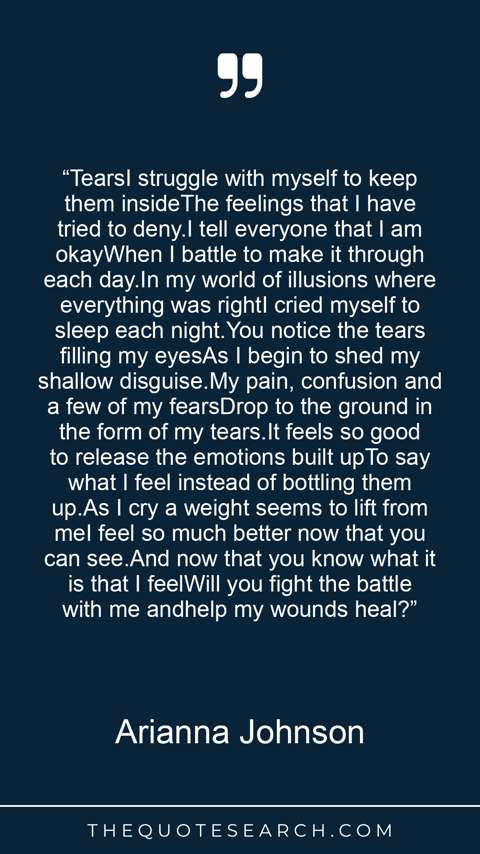 “TearsI struggle with myself to keep them insideThe feelings that I have tried to deny.I tell everyone that I am okayWhen I battle to make it through each day.In my world of illusions where everything was rightI cried myself to sleep each night.You notice the tears filling my eyesAs I begin to shed my shallow disguise.My pain, confusion and a few of my fearsDrop to the ground in the form of my tears.It feels so good to release the emotions built upTo say what I feel instead of bottling them up.As I cry a weight seems to lift from meI feel so much better now that you can see.And now that you know what it is that I feelWill you fight the battle with me andhelp my wounds heal?”
