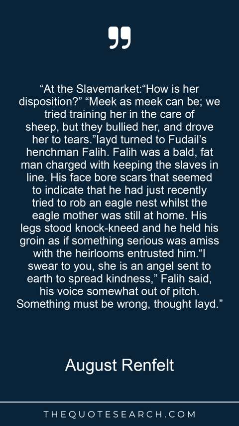 “At the Slavemarket:“How is her disposition?” “Meek as meek can be; we tried training her in the care of sheep, but they bullied her, and drove her to tears.”Iayd turned to Fudail’s henchman Falih. Falih was a bald, fat man charged with keeping the slaves in line. His face bore scars that seemed to indicate that he had just recently tried to rob an eagle nest whilst the eagle mother was still at home. His legs stood knock-kneed and he held his groin as if something serious was amiss with the heirlooms entrusted him.“I swear to you, she is an angel sent to earth to spread kindness,” Falih said, his voice somewhat out of pitch. Something must be wrong, thought Iayd.”