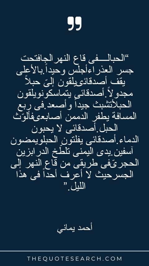 “الحبالــــفى قاع النهرالجافتحت جسر العذراءأجلس وحيداً.بالأعلى يقف أصدقائىيلقون إلىّ حبلاً مجدولاً.أصدقائى يتماسكونويلقون الحبلأتشبث جيداً وأصعد.فى ربع المسافة يطفر الدممن أصابعىفألوّث الحبل.أصدقائى لا يحبون الدماء.أصدقائى يفلتون الحبلويمضون آسفين.يدى اليمنى تلطّخ الدرابزين الحجرىّفى طريقى من قاع النهر إلى الجسرحيث لا أعرف أحداً فى هذا الليل.”