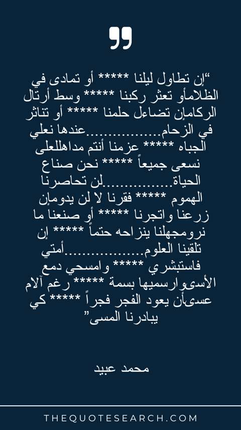 “إن تطاول ليلنا ***** أو تمادى في الظلامأو تعثر ركبنا ***** وسط أرتال الركامإن تضاءل حلمنا ***** أو تناثر في الزحام.................عندها نعلي الجباه ***** عزمنا أنتم مداهللعلى نسعى جميعاً ***** نحن صناع الحياة................لن تحاصرنا الهموم ***** فقرنا لا لن يدومإن زرعنا واتجرنا ***** أو صنعنا ما نرومجهلنا ينزاحه حتماً ***** إن تلقينا العلوم..................أمتي فاستبشري ***** وامسحي دمع الأسىوارسميها بسمة ***** رغم آلام عسىأن يعود الفجر فجراً ***** كي يبادرنا المسى”