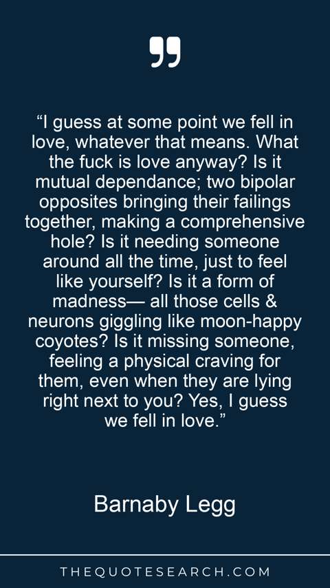 “I guess at some point we fell in love, whatever that means. What the fuck is love anyway? Is it mutual dependance; two bipolar opposites bringing their failings together, making a comprehensive hole? Is it needing someone around all the time, just to feel like yourself? Is it a form of madness— all those cells & neurons giggling like moon-happy coyotes? Is it missing someone, feeling a physical craving for them, even when they are lying right next to you? Yes, I guess we fell in love.”