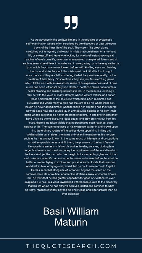 “As we advance in the spiritual life and in the practice of systematic self-examination we are often surprised by the discovery of vast unknown tracts of the inner life of the soul. They seem like great plains stretching out in mystery and wrapt in mists that sometimes for a moment lift, or sweep off and leave one looking for one brief instant upon great reaches of one’s own life, unknown, unmeasured, unexplored. Men stand at such moments breathless in wonder and in awe gazing upon these great tracts upon which they have never looked before, with kindling eyes and beating hearts; and while they look the mists steal back till all is lost to sight once more and they are left wondering if what they saw was reality, or the creation of their fancy. Or sometimes they see, not far-stretching plains which fill the soul with an awestruck sense of its expansiveness and of how much has been left absolutely uncultivated, not these plains but mountain peaks climbing and reaching upwards till lost in the heavens, echoing it may be with the voice of many streams whose waters fertilize and enrich those small tracts of the soul’s life which have been reclaimed and cultivated and which many a man has thought to be his whole inner self, though he never asked himself whence those rich streams had their source. Now he sees how their source lay in unmeasured heights of his own inner being whose existence he never dreamed of before. In one brief instant they have unveiled themselves. He looks again, and they are shut out from his eyes, there is no token visible that he possesses such reaches, such heights of life. The commonplaces of his existence gather in and crowd upon him, the ordinary routine of life settles down upon him, limiting and confining him on all sides, the same unbroken line measures his horizon, such as he has always known it, the same round of interests and occupations crowd in upon his hours and fill them, the pressure of the hard facts of life upon him are as unmistakable and as leveling as ever, bidding him forget his dreams and meet and obey the requirements of the world in which he lives. And yet the man who has caught but a momentary glimpse of that vast unknown inner life can never be the same as he was before; he must be better or worse, trying to explore and possess and cultivate that unknown world within him, or trying—oh, would that he could succeed!—to forget it. He has seen that alongside of, or far out beyond the reach of, the commonplace life of routine, another life stretches away whither he knows not, he feels that he has greater capacities for good or evil than he ever imagined. He has, in a word, awakened with tremulous awe to the discovery that his life which he has hitherto believed limited and confined to what he knew, reaches infinitely beyond his knowledge and is far greater than he ever dreamed.”