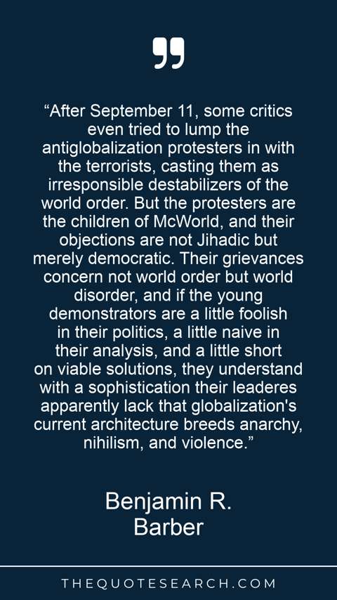 “After September 11, some critics even tried to lump the antiglobalization protesters in with the terrorists, casting them as irresponsible destabilizers of the world order. But the protesters are the children of McWorld, and their objections are not Jihadic but merely democratic. Their grievances concern not world order but world disorder, and if the young demonstrators are a little foolish in their politics, a little naive in their analysis, and a little short on viable solutions, they understand with a sophistication their leaderes apparently lack that globalization's current architecture breeds anarchy, nihilism, and violence.”