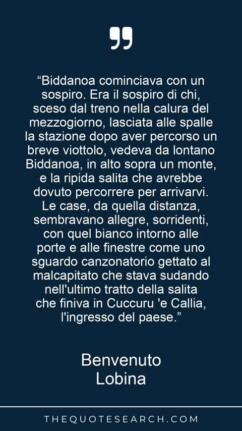 “Biddanoa cominciava con un sospiro. Era il sospiro di chi, sceso dal treno nella calura del mezzogiorno, lasciata alle spalle la stazione dopo aver percorso un breve viottolo, vedeva da lontano Biddanoa, in alto sopra un monte, e la ripida salita che avrebbe dovuto percorrere per arrivarvi. Le case, da quella distanza, sembravano allegre, sorridenti, con quel bianco intorno alle porte e alle finestre come uno sguardo canzonatorio gettato al malcapitato che stava sudando nell'ultimo tratto della salita che finiva in Cuccuru 'e Callia, l'ingresso del paese.”