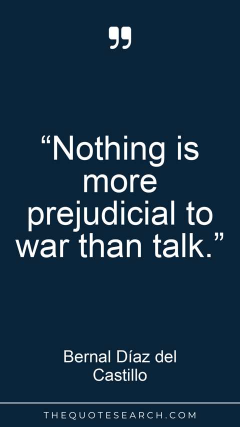 When considering the quote by Bernal Díaz del Castillo, "Nothing is more prejudicial to war than talk," what do you think he meant by this statement? How might communication and discussion impact the outcomes of conflicts and wars? Do you think there are situations where talking can be beneficial in the context of war, or do you agree with the idea that talking can be prejudicial? How can diplomacy and negotiation play a role in preventing or resolving conflicts?