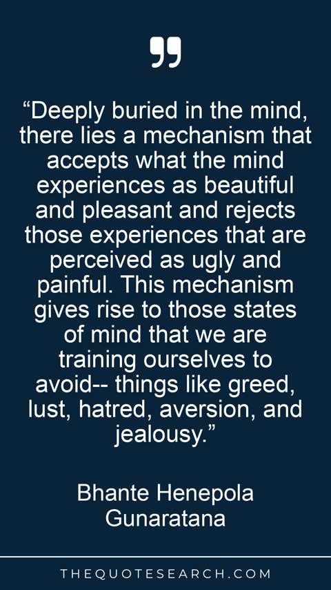 “Deeply buried in the mind, there lies a mechanism that accepts what the mind experiences as beautiful and pleasant and rejects those experiences that are perceived as ugly and painful. This mechanism gives rise to those states of mind that we are training ourselves to avoid-- things like greed, lust, hatred, aversion, and jealousy.”