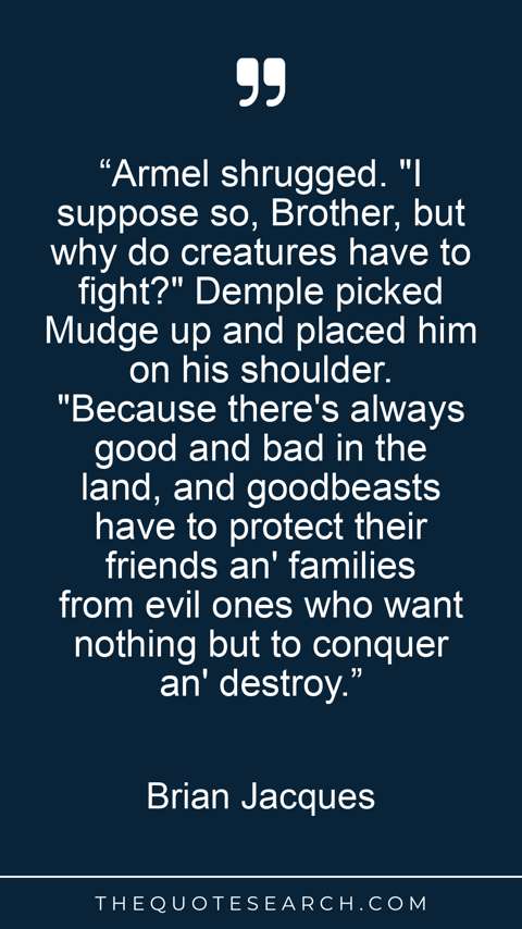 “Armel shrugged. "I suppose so, Brother, but why do creatures have to fight?" Demple picked Mudge up and placed him on his shoulder. "Because there's always good and bad in the land, and goodbeasts have to protect their friends an' families from evil ones who want nothing but to conquer an' destroy.”