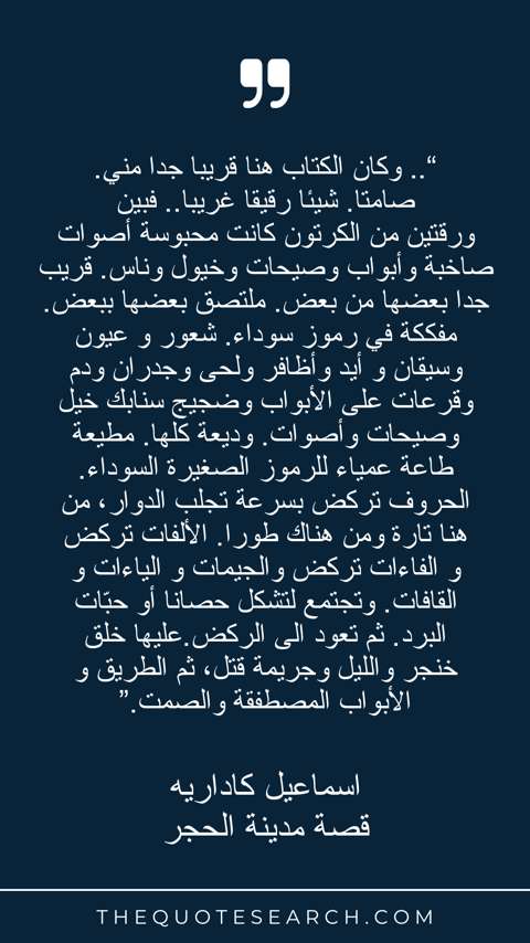 “.. وكان الكتاب هنا قريبا جدا مني. صامتا. شيئا رقيقا غريبا.. فبين ورقتين من الكرتون كانت محبوسة أصوات صاخبة وأبواب وصيحات وخيول وناس. قريب جدا بعضها من بعض. ملتصق بعضها ببعض. مفككة في رموز سوداء. شعور و عيون وسيقان و أيد وأظافر ولحى وجدران ودم وقرعات على الأبواب وضجيج سنابك خيل وصيحات وأصوات. وديعة كلها. مطيعة طاعة عمياء للرموز الصغيرة السوداء. الحروف تركض بسرعة تجلب الدوار، من هنا تارة ومن هناك طورا. الألفات تركض و الفاءات تركض والجيمات و الياءات و القافات. وتجتمع لتشكل حصانا أو حبّات البرد. ثم تعود الى الركض.عليها خلق خنجر والليل وجريمة قتل، ثم الطريق و الأبواب المصطفقة والصمت.”