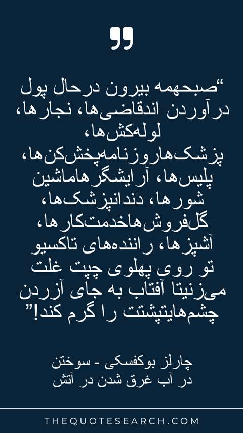 “صبحهمه بیرون درحال پول درآوردن اندقاضیها، نجارها، لولهکشها، پزشکهاروزنامهپخشکنها، پلیسها، آرایشگرهاماشین شورها، دندانپزشکها، گلفروشهاخدمتکارها، آشپزها، رانندههای تاکسیو تو روی پهلوی چپت غلت میزنیتا آفتاب به جای آزردن چشمهایتپشتت را گرم کند!”