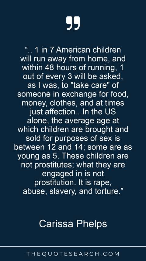 “.. 1 in 7 American children will run away from home, and within 48 hours of running, 1 out of every 3 will be asked, as I was, to "take care" of someone in exchange for food, money, clothes, and at times just affection...In the US alone, the average age at which children are brought and sold for purposes of sex is between 12 and 14; some are as young as 5. These children are not prostitutes; what they are engaged in is not prostitution. It is rape, abuse, slavery, and torture.”