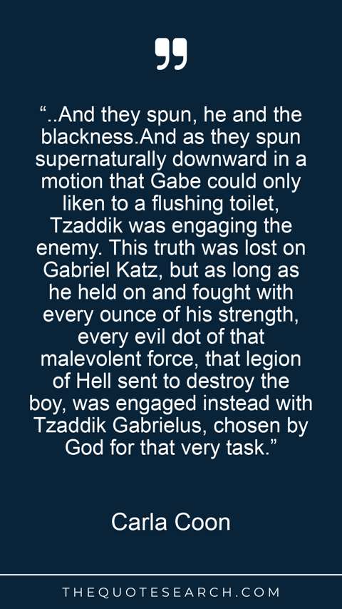 “..And they spun, he and the blackness.And as they spun supernaturally downward in a motion that Gabe could only liken to a flushing toilet, Tzaddik was engaging the enemy. This truth was lost on Gabriel Katz, but as long as he held on and fought with every ounce of his strength, every evil dot of that malevolent force, that legion of Hell sent to destroy the boy, was engaged instead with Tzaddik Gabrielus, chosen by God for that very task.”