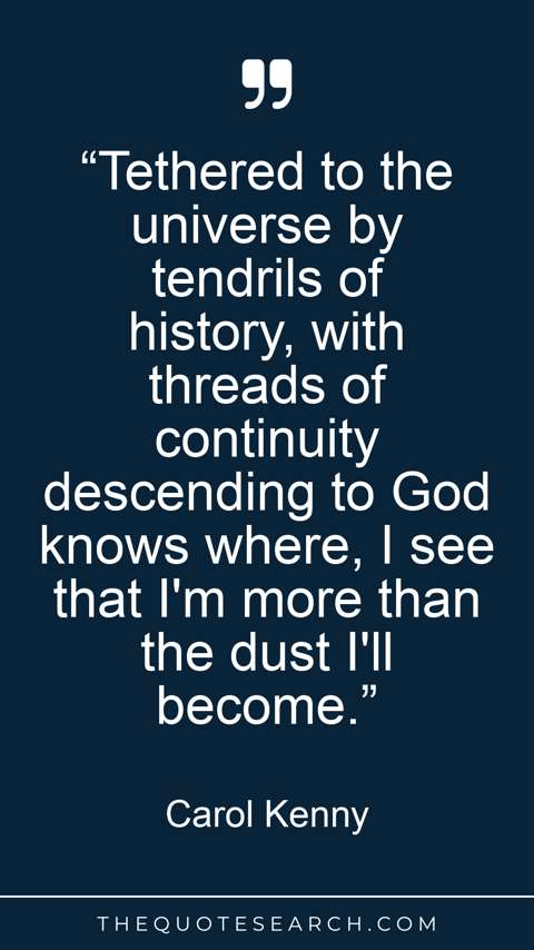 “Tethered to the universe by tendrils of history, with threads of continuity descending to God knows where, I see that I'm more than the dust I'll become.”