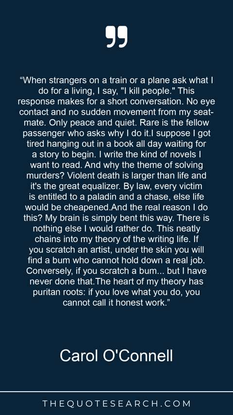 “When strangers on a train or a plane ask what I do for a living, I say, "I kill people." This response makes for a short conversation. No eye contact and no sudden movement from my seat-mate. Only peace and quiet. Rare is the fellow passenger who asks why I do it.I suppose I got tired hanging out in a book all day waiting for a story to begin. I write the kind of novels I want to read. And why the theme of solving murders? Violent death is larger than life and it's the great equalizer. By law, every victim is entitled to a paladin and a chase, else life would be cheapened.And the real reason I do this? My brain is simply bent this way. There is nothing else I would rather do. This neatly chains into my theory of the writing life. If you scratch an artist, under the skin you will find a bum who cannot hold down a real job. Conversely, if you scratch a bum... but I have never done that.The heart of my theory has puritan roots: if you love what you do, you cannot call it honest work.”