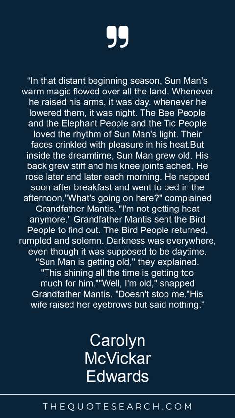 “In that distant beginning season, Sun Man's warm magic flowed over all the land. Whenever he raised his arms, it was day. whenever he lowered them, it was night. The Bee People and the Elephant People and the Tic People loved the rhythm of Sun Man's light. Their faces crinkled with pleasure in his heat.But inside the dreamtime, Sun Man grew old. His back grew stiff and his knee joints ached. He rose later and later each morning. He napped soon after breakfast and went to bed in the afternoon."What's going on here?" complained Grandfather Mantis. "I'm not getting heat anymore." Grandfather Mantis sent the Bird People to find out. The Bird People returned, rumpled and solemn. Darkness was everywhere, even though it was supposed to be daytime. "Sun Man is getting old," they explained. "This shining all the time is getting too much for him.""Well, I'm old," snapped Grandfather Mantis. "Doesn't stop me."His wife raised her eyebrows but said nothing.”