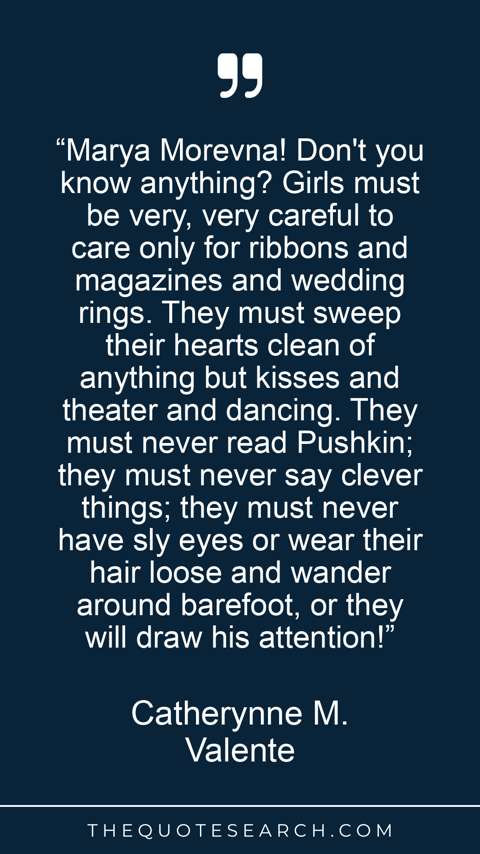 “Marya Morevna! Don't you know anything? Girls must be very, very careful to care only for ribbons and magazines and wedding rings. They must sweep their hearts clean of anything but kisses and theater and dancing. They must never read Pushkin; they must never say clever things; they must never have sly eyes or wear their hair loose and wander around barefoot, or they will draw his attention!”