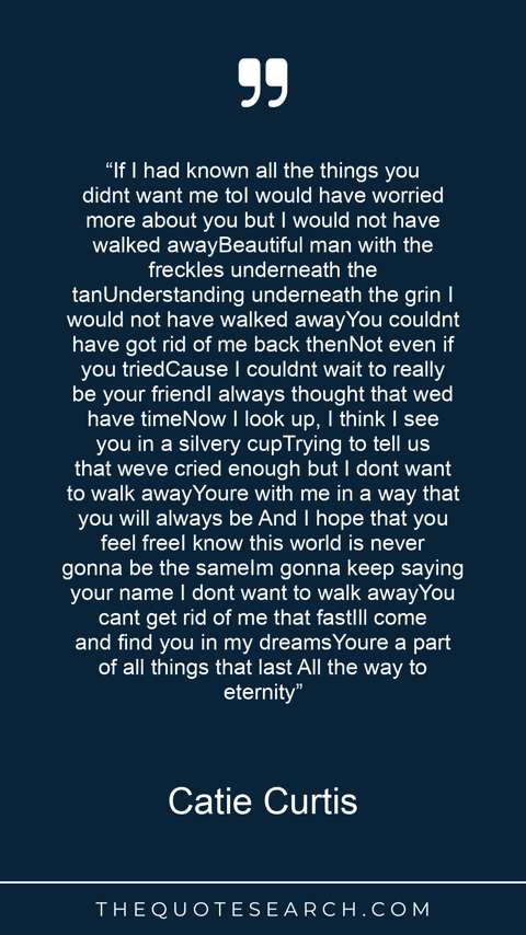 “If I had known all the things you didnt want me toI would have worried more about you but I would not have walked awayBeautiful man with the freckles underneath the tanUnderstanding underneath the grin I would not have walked awayYou couldnt have got rid of me back thenNot even if you triedCause I couldnt wait to really be your friendI always thought that wed have timeNow I look up, I think I see you in a silvery cupTrying to tell us that weve cried enough but I dont want to walk awayYoure with me in a way that you will always be And I hope that you feel freeI know this world is never gonna be the sameIm gonna keep saying your name I dont want to walk awayYou cant get rid of me that fastIll come and find you in my dreamsYoure a part of all things that last All the way to eternity”